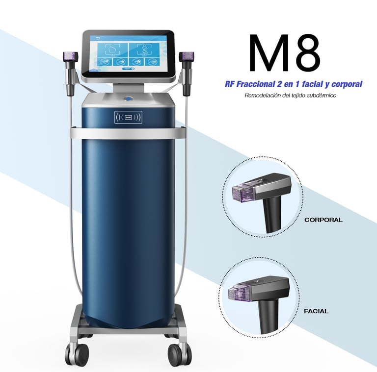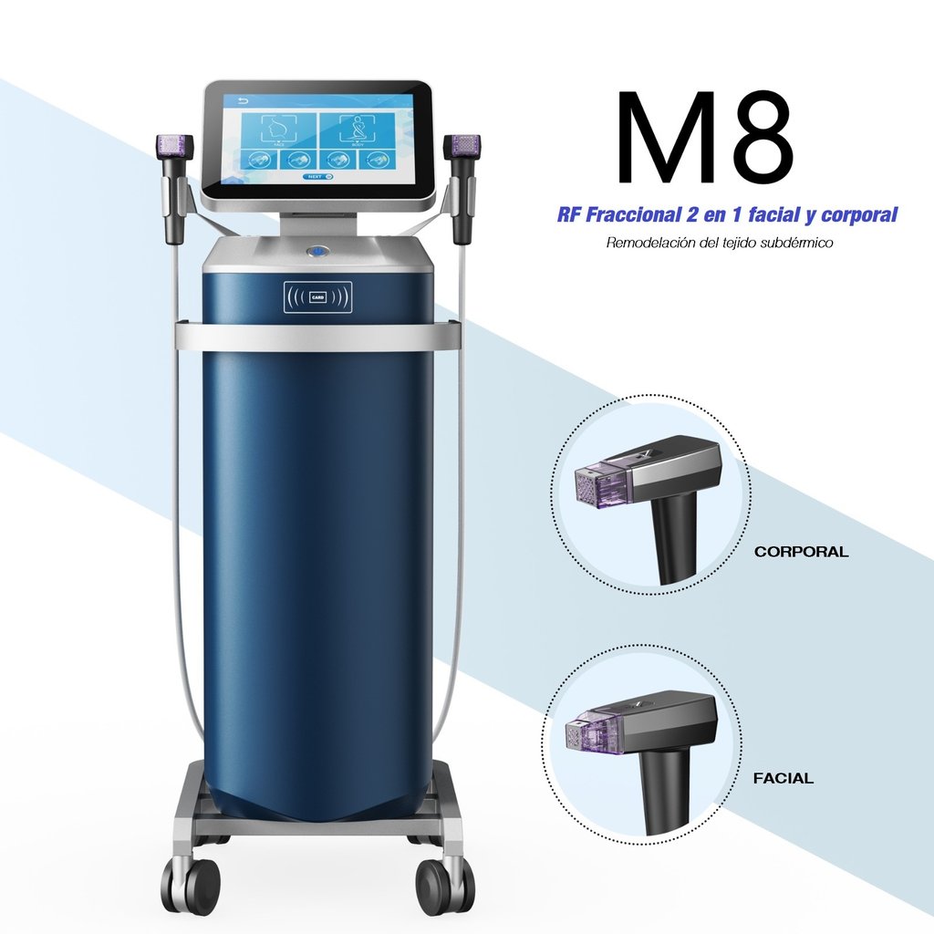 La máquina M8 de radiofrecuencia fraccionada funciona mediante la combinación de radiofrecuencia y un sistema de microagujas. Este tratamiento mínimamente invasivo introduce micropins teflonados y cubiertos de oro en las capas más profundas de la piel para estimular la producción de colágeno y remodelar el tejido subdérmico.